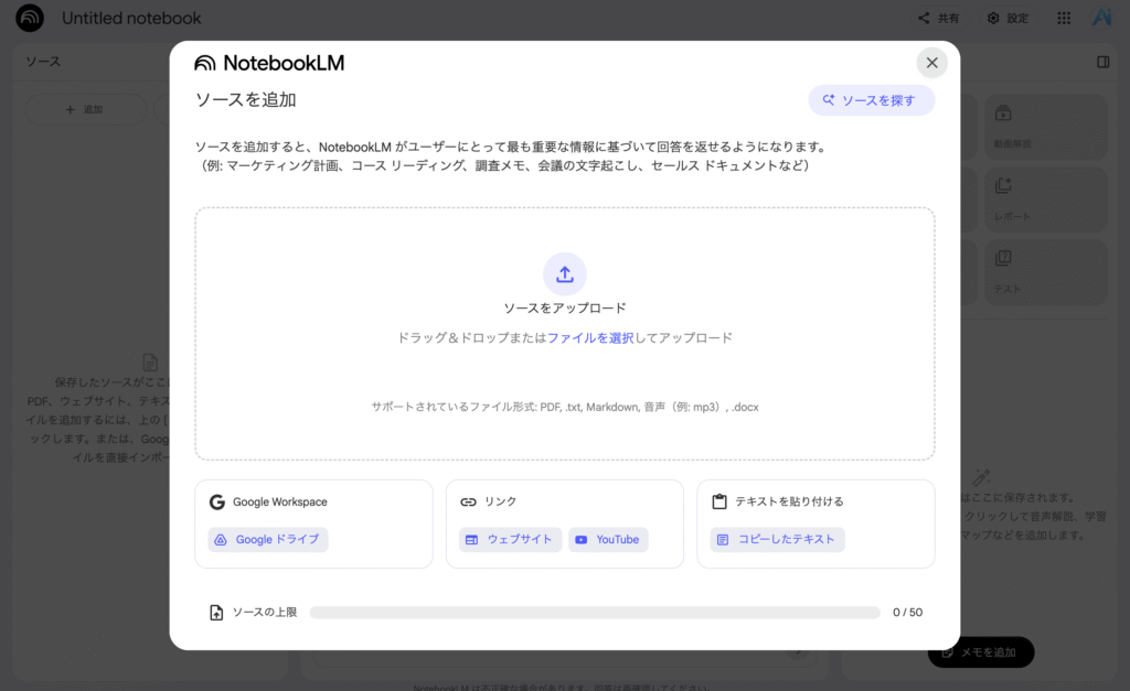 NotebookLMでクイズを作成するには、まずNotebookLMにソースを追加する必要があります。