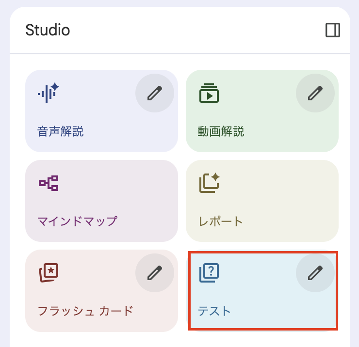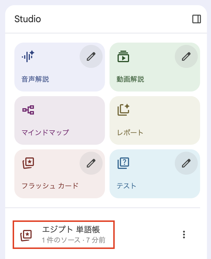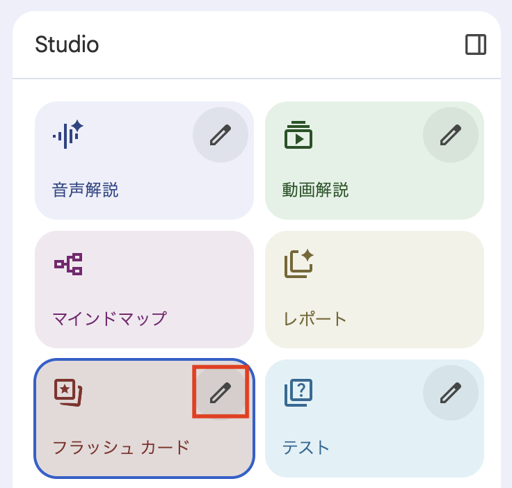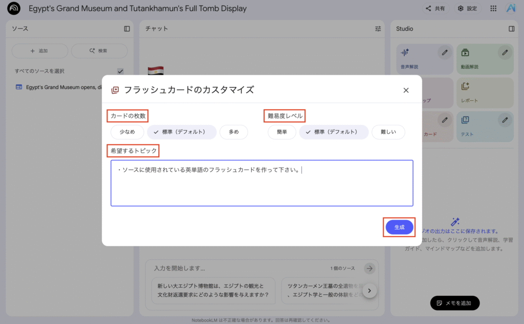 それでは、NotebookLMで問題を作る下準備ができたので、フラッシュカード、テストのそれぞれで問題を作る方法を紹介していきます。