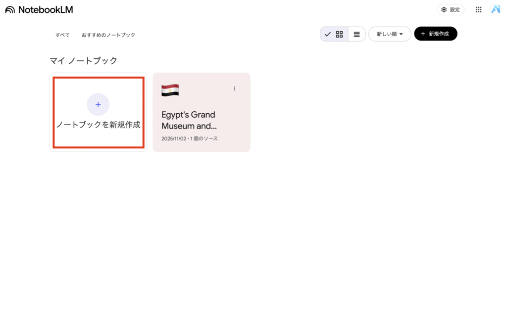 NotebookLMを開いて「ノートブックを新規作成」をクリックします。