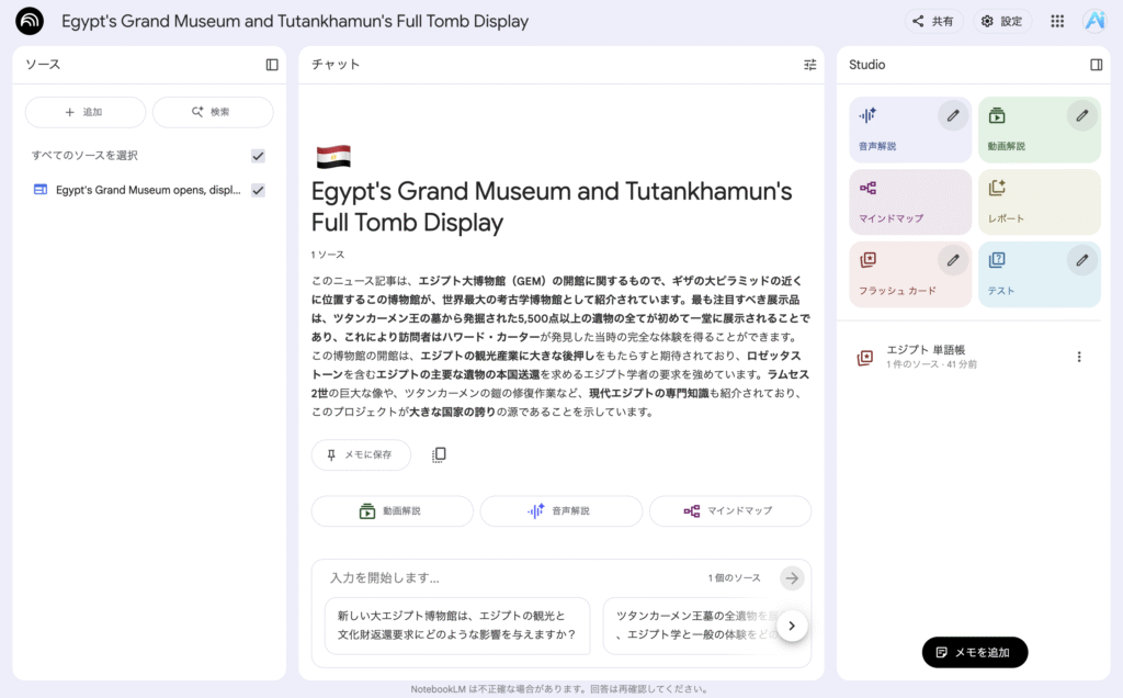 あなたが書いたノートやアップロードした資料をAIが読んで、要点をまとめたり、質問を作ったり、暗記カードを自動で作成したりできる、とても便利なツールです。