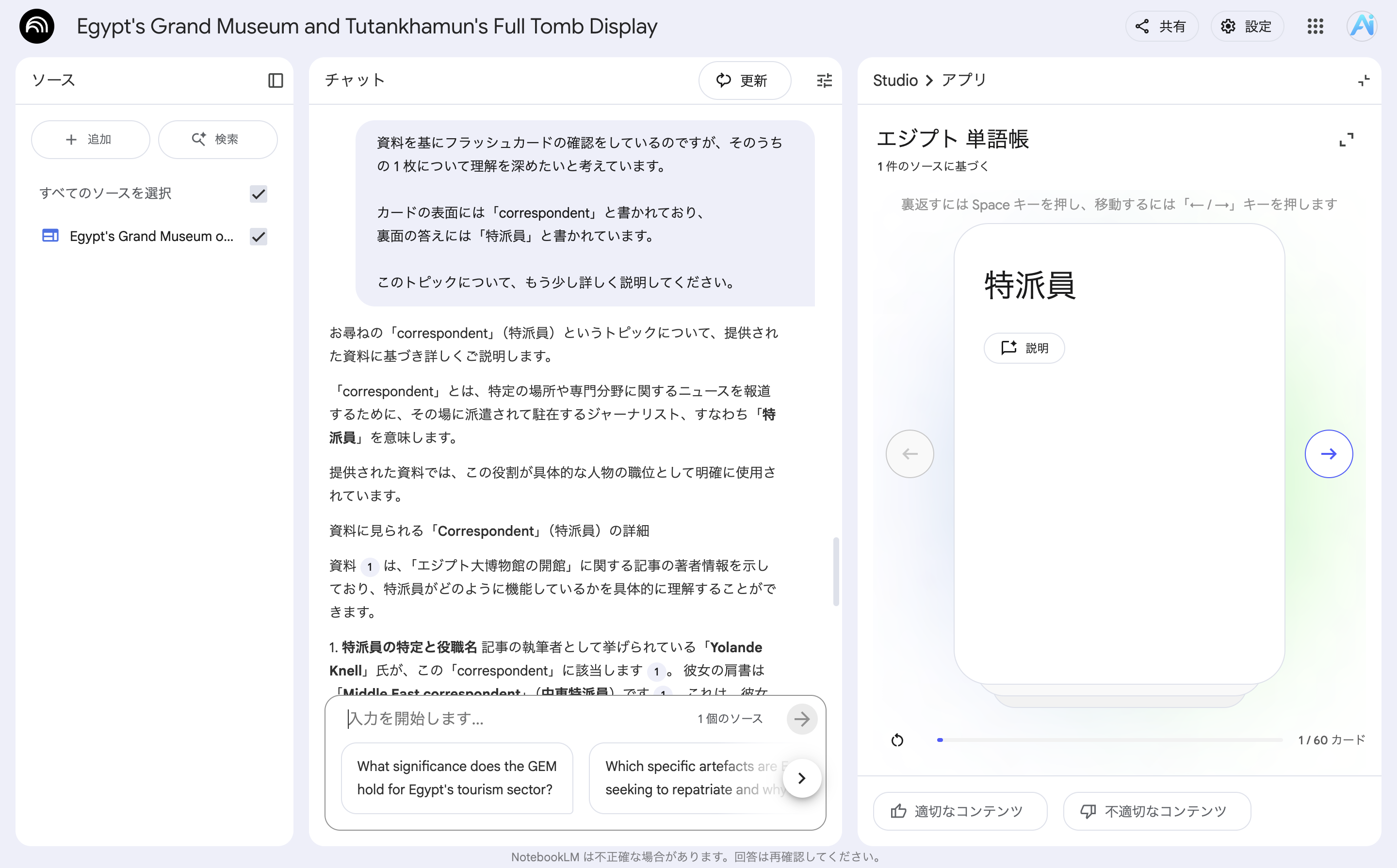 でもNotebookLMなら、AIが自動でカードや問題を作ってくれるので、手間がかかりません。しかも、ノートの内容とちゃんとつながっているので、文脈を理解しながら勉強できます。