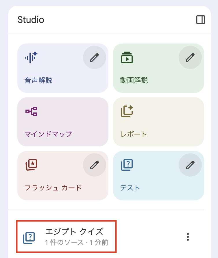 NotebookLMでは、あなたのノートや資料をもとにAIが自動で問題を作ってくれる機能が用意されています。
