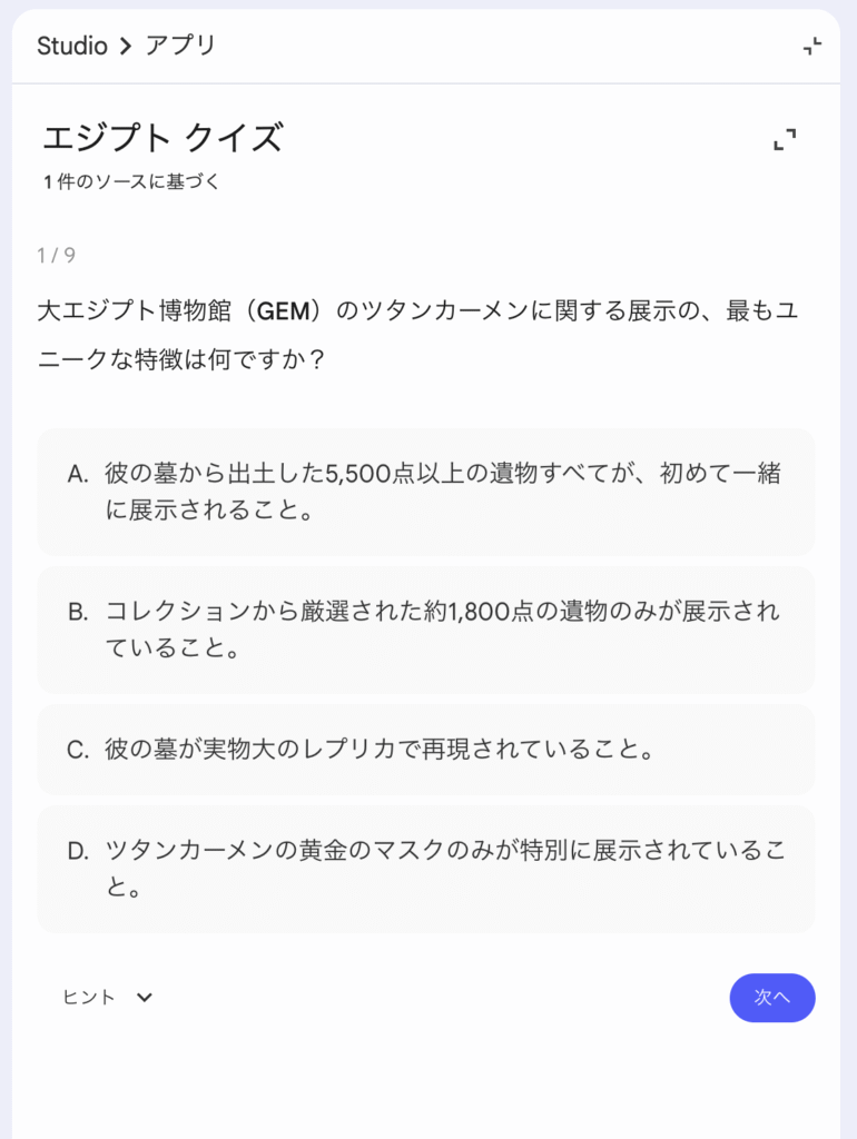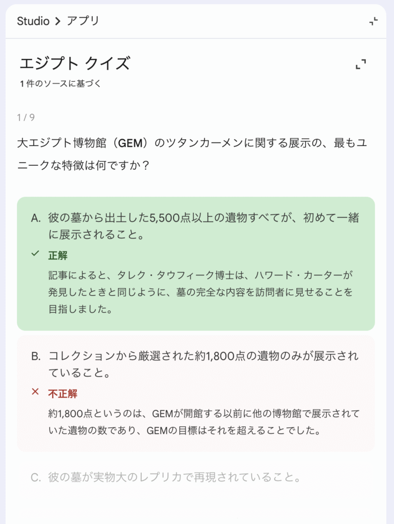 NotebookLMのAIが、あなたのノートを読み込み、理解度をチェックするためのクイズ形式の問題を自動で作ってくれます。